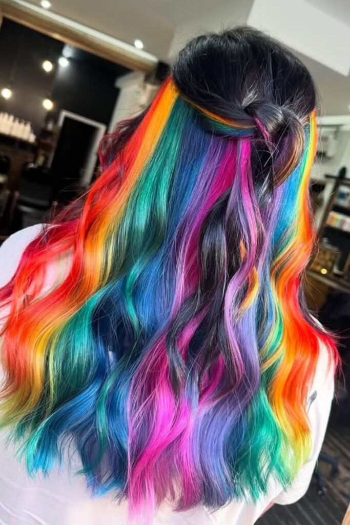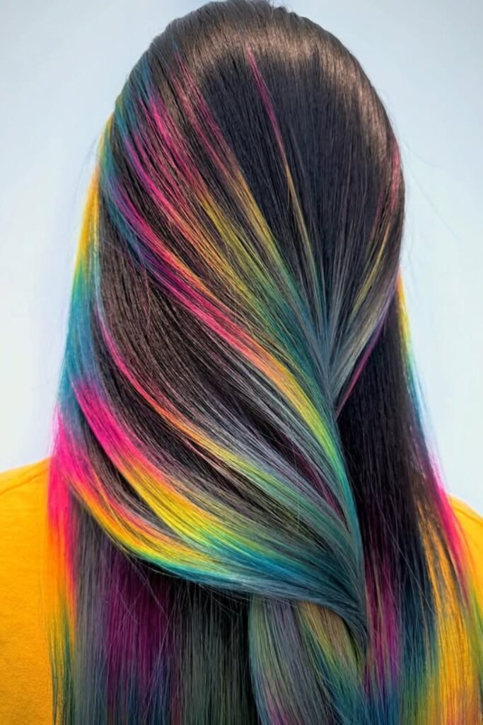 Bright streaks of yellow, pink, and teal hidden under dark brown hair create a mesmerizing layered effect that glows when styled.
