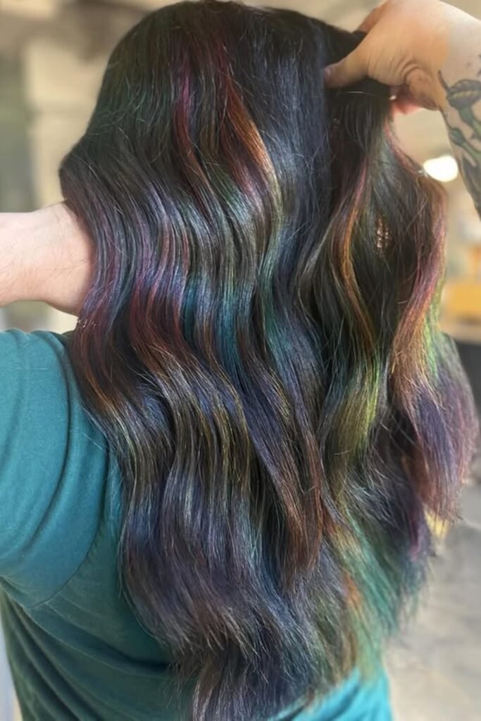 Deep jewel tones like teal, violet, and bronze swirl together for a glossy, oil-slick effect that glimmers under light.