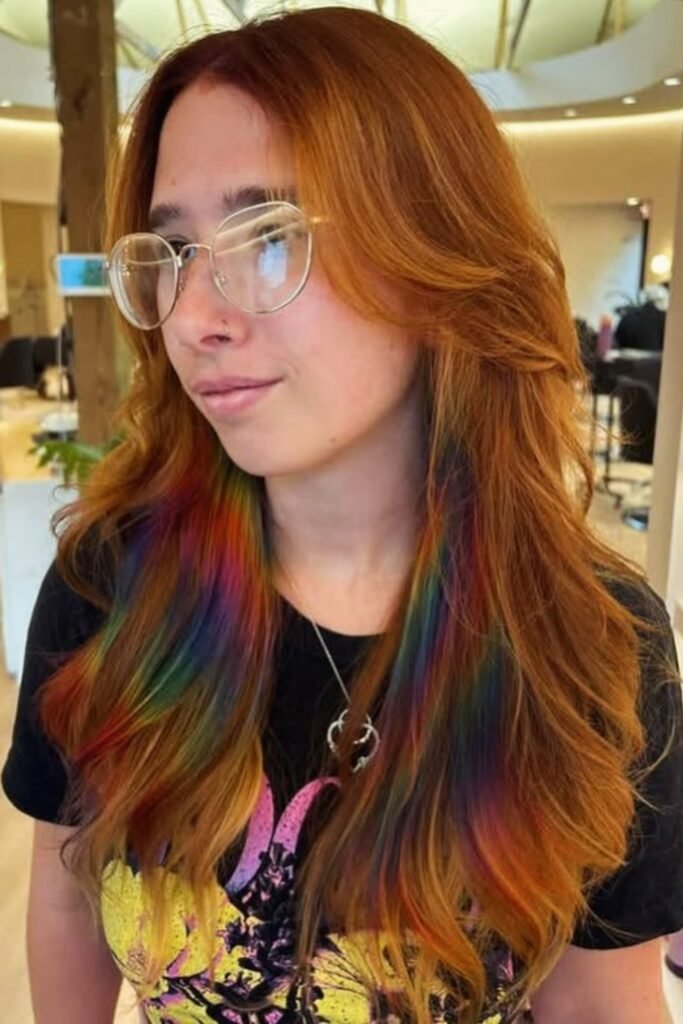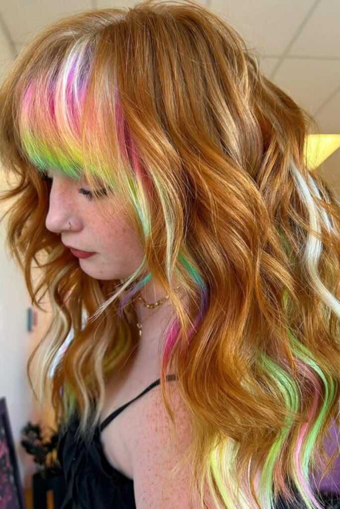 A soft ginger base paired with pastel rainbow bangs creates an instant focal point that brightens the face.