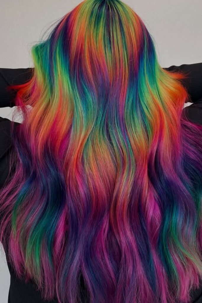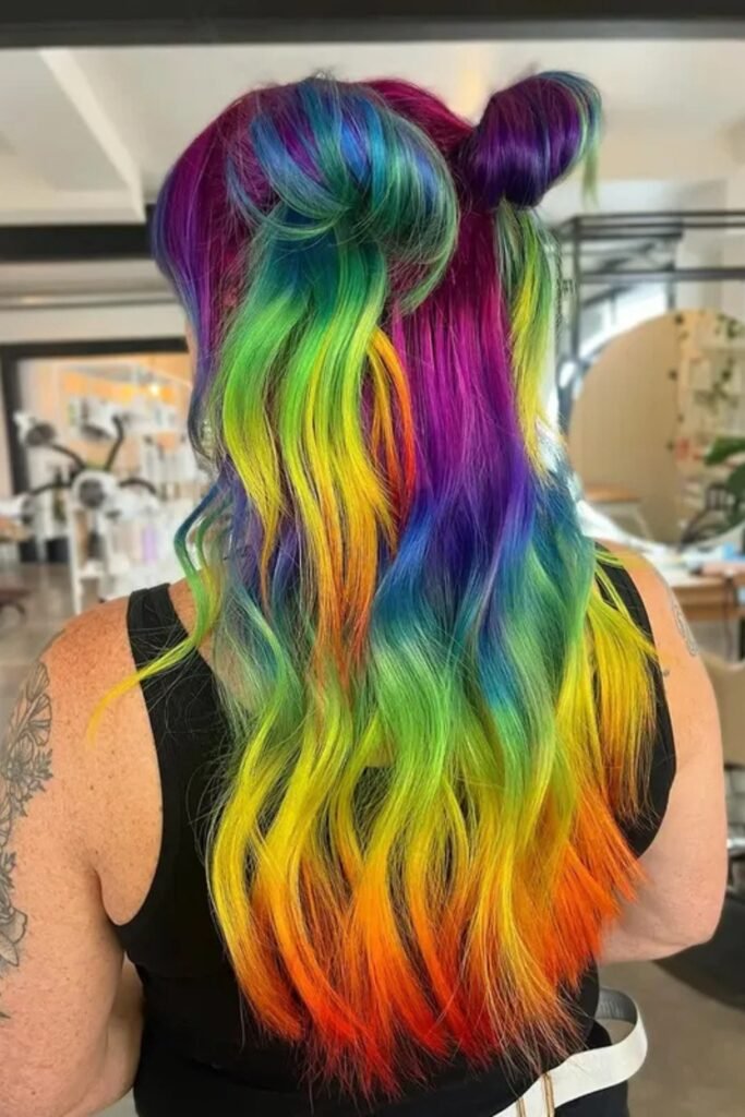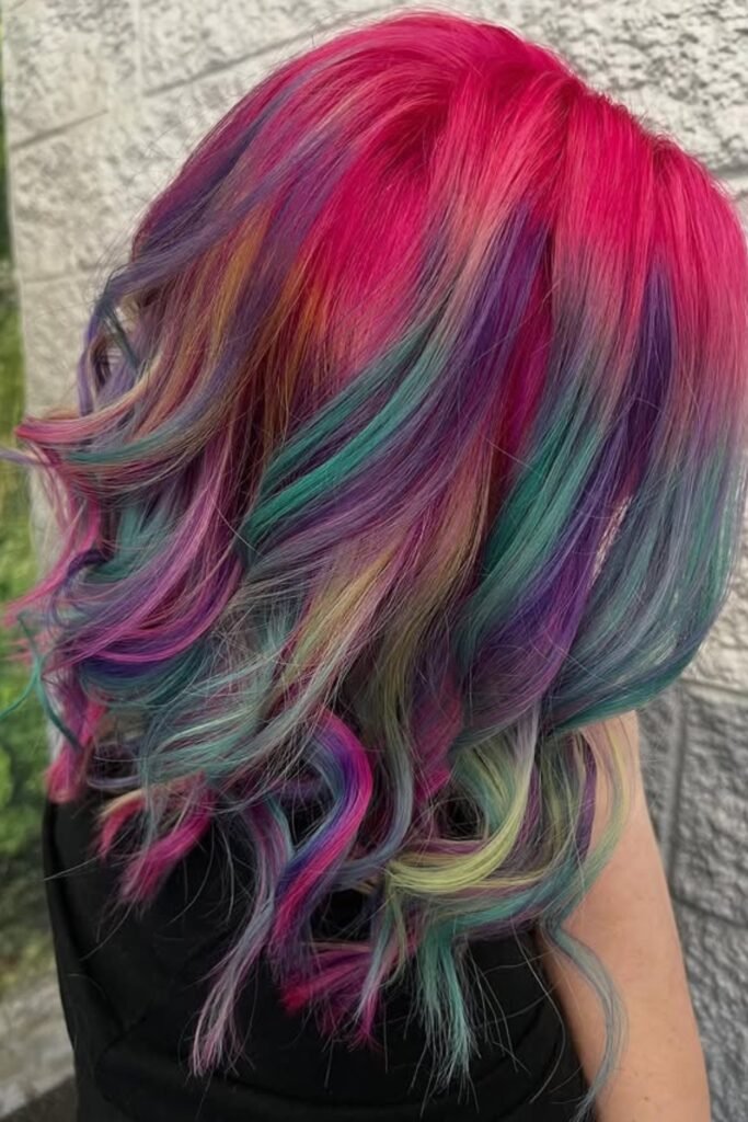 The bright mix of neon pinks, oranges, greens, and blues looks great on wavy hair, catching light from all sides.