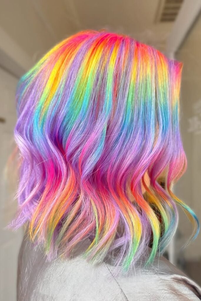 Electric streaks of pink, yellow, and blue blend into a pastel lavender base, giving this bob a glowing, cloudlike finish.