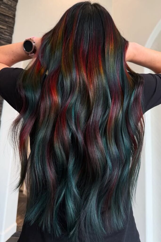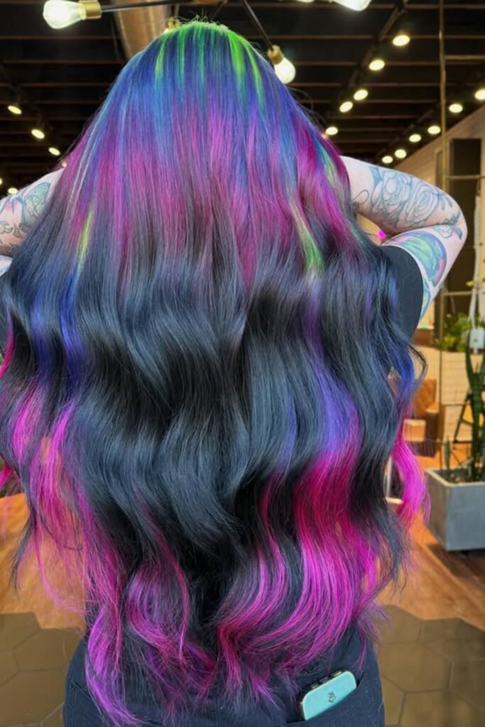 Dark roots fading into neon streaks of magenta, purple, and green give this look a bold night-sky energy.