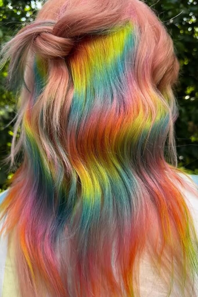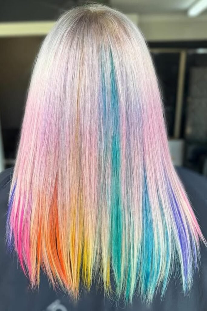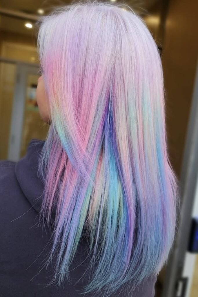 The easiest approach to get it is to first lighten your hair to a pale blonde and then add high-saturation colors on top of that for the soft-neon effect.