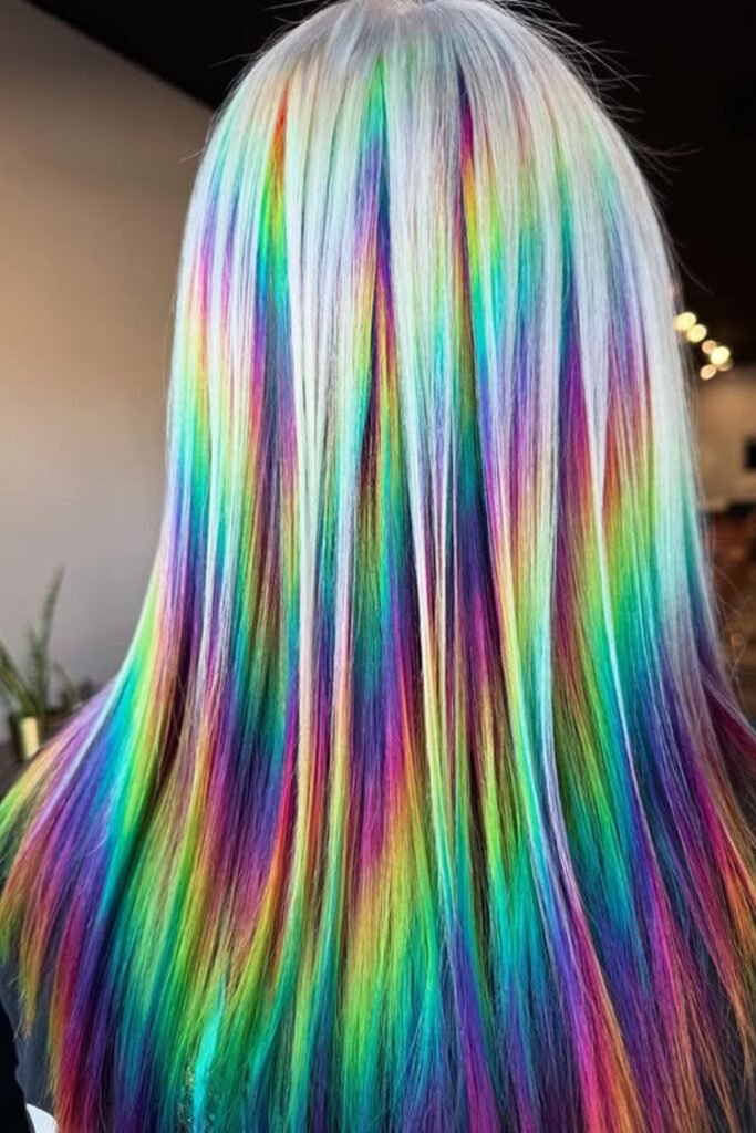 Vivid streaks of every color flow through a platinum base, creating a sharp, glassy prism effect that shifts as the hair moves.