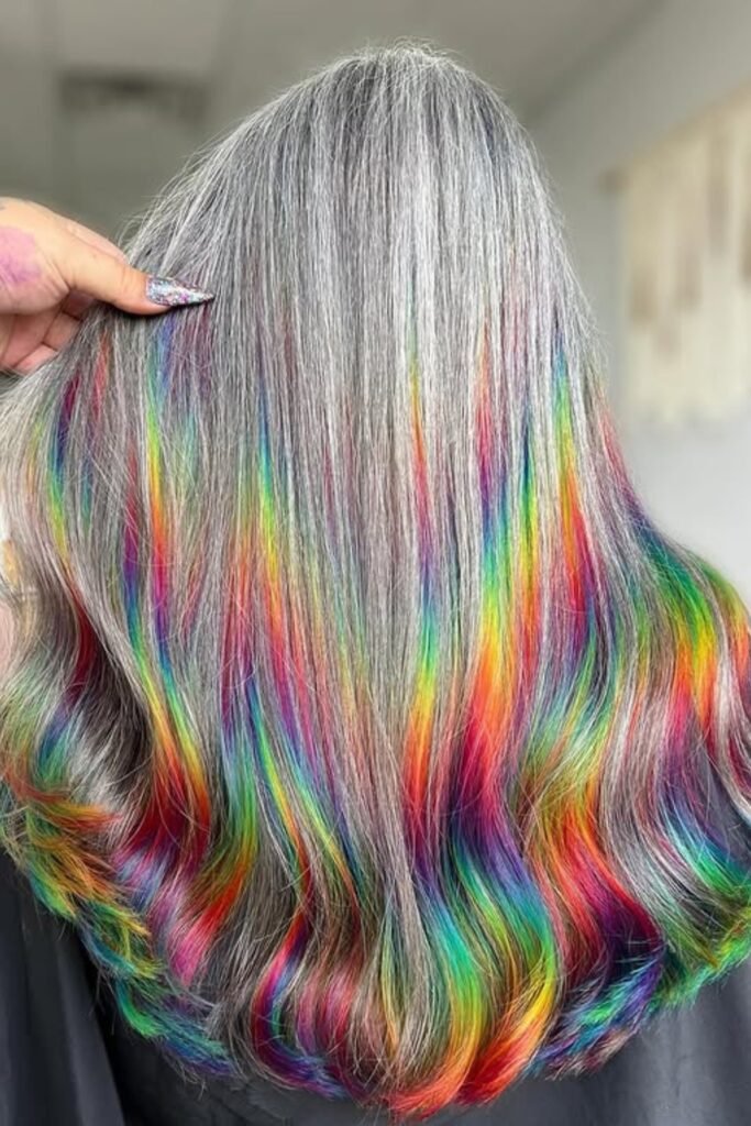 Natural gray or silver hair turns into a showpiece with hidden rainbow streaks that shimmer from underneath.