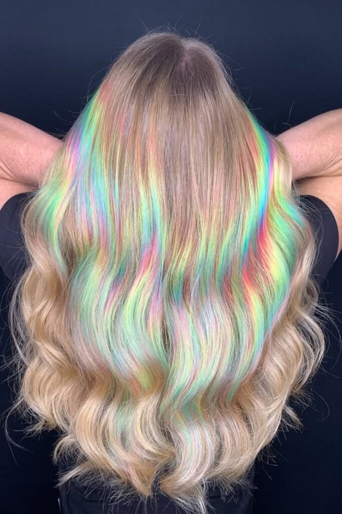 Soft rainbow reflections on a warm blonde base give this style a holographic glow that shifts in the light.