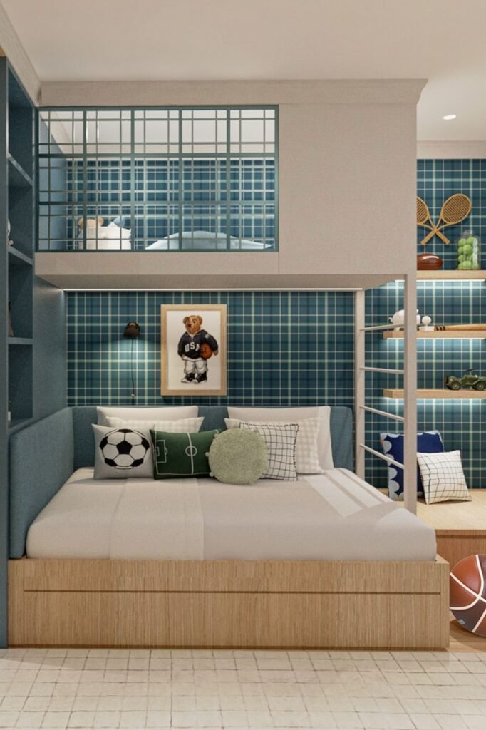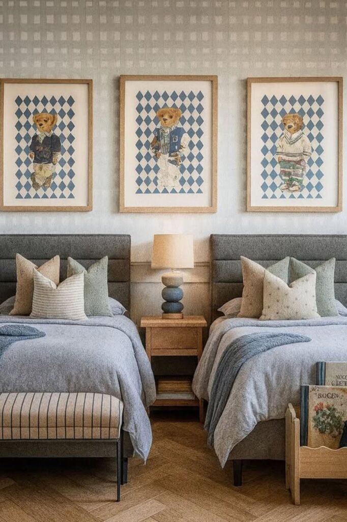 Balance creates calm especially in a shared bedroom. Matching upholstered beds in soft check pattern instantly make the room feel coordinated with out looking stiff.