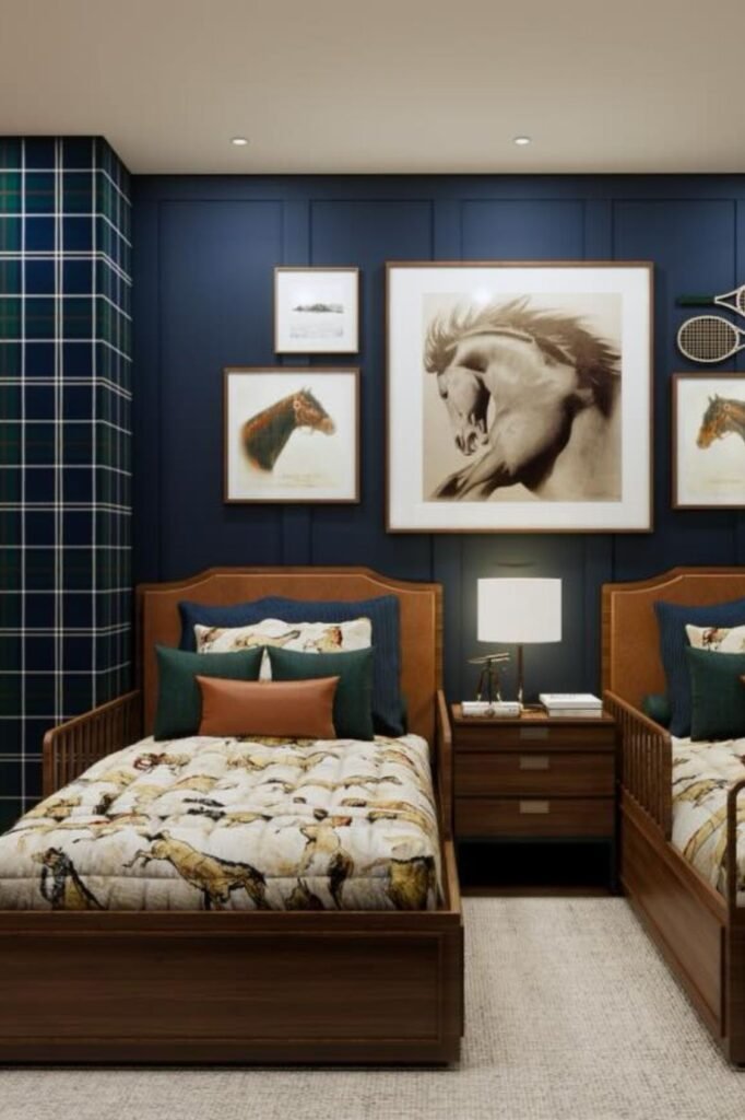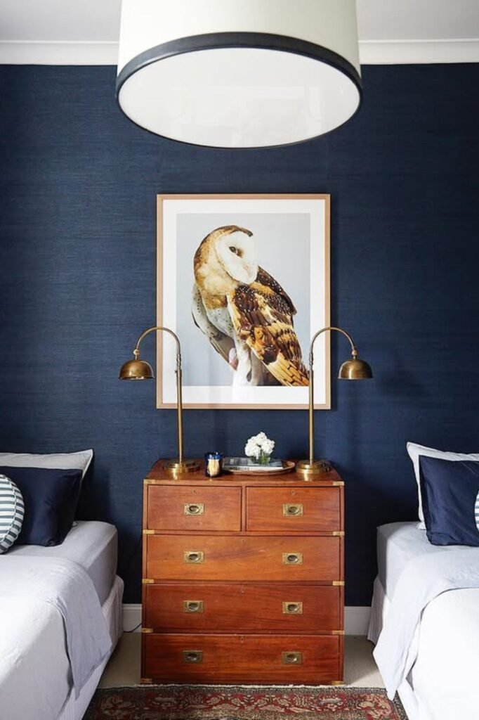 Deep navy behind the beds changes the entire mood of the room. Instead of filling the space with patterns, one solid, saturated wall creates instant depth.