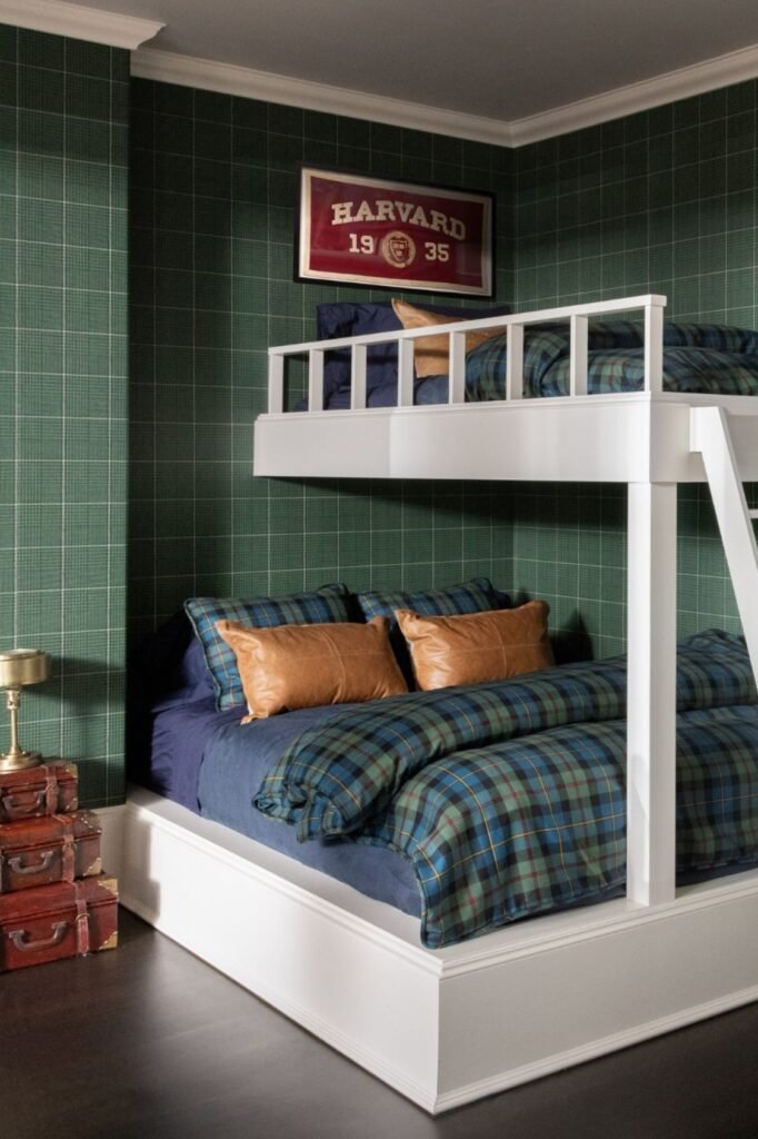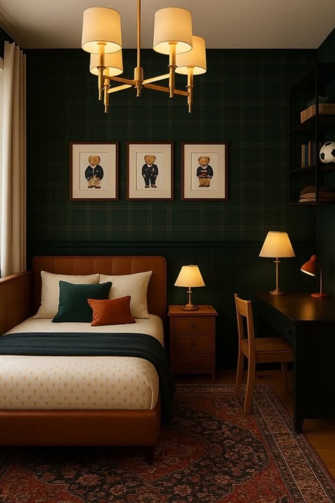 Cozy corners turn a bedroom into a space kids actually want to spend time in. Deep plaid walls paired with a darker lower panel create that classic Ralph Lauren mood.