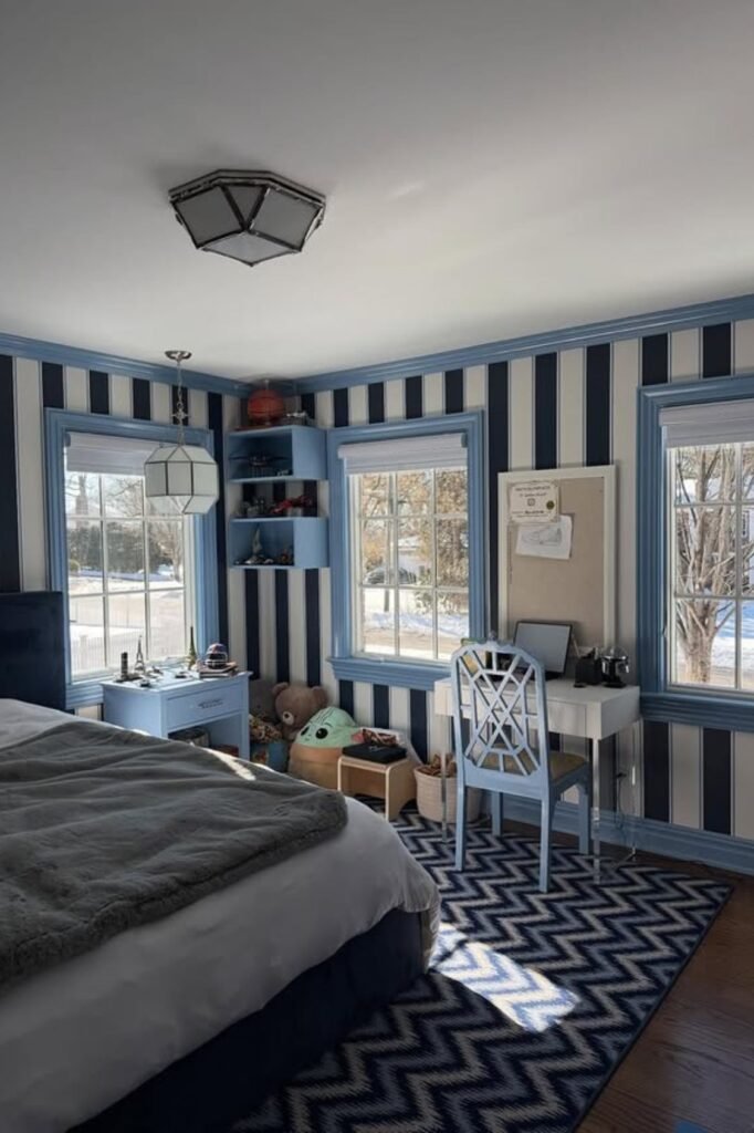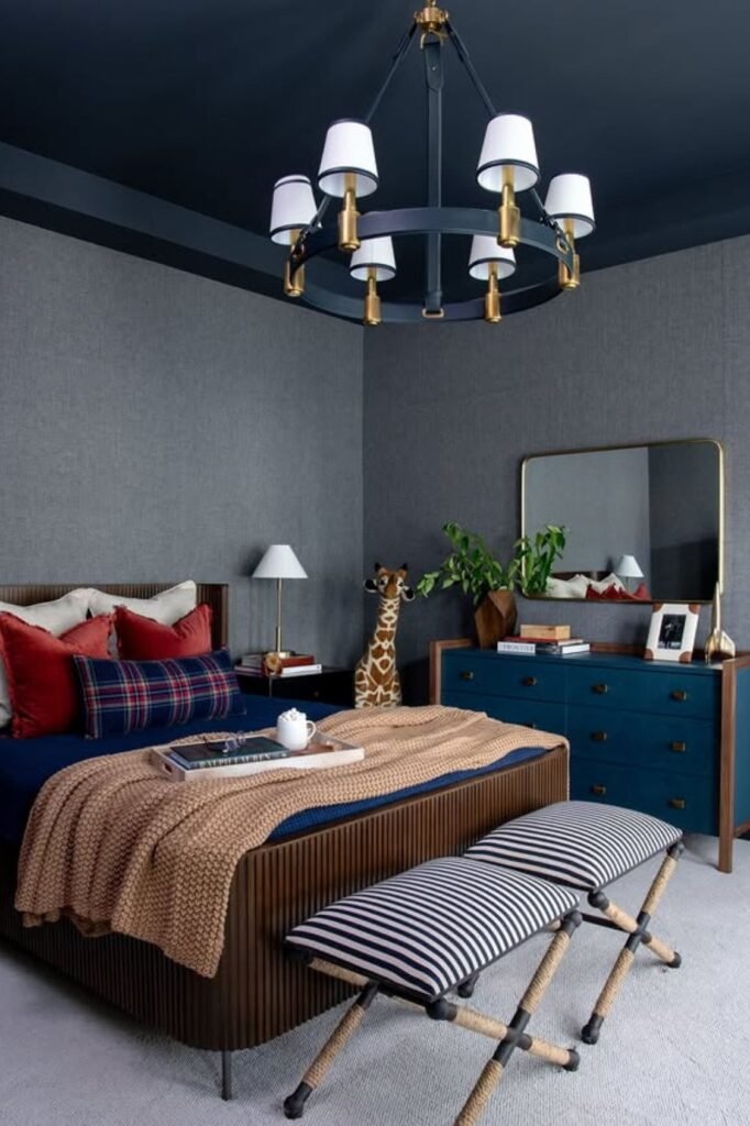Ceilings deserve attention. Painting the ceiling a deep navy instantly adds depth and makes the room feel more custom.
