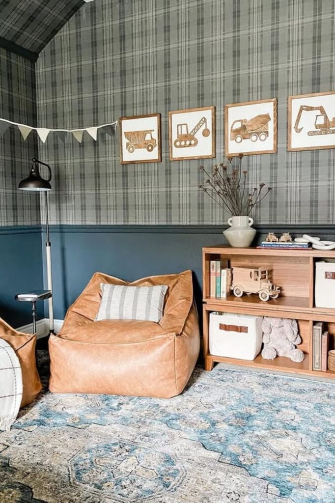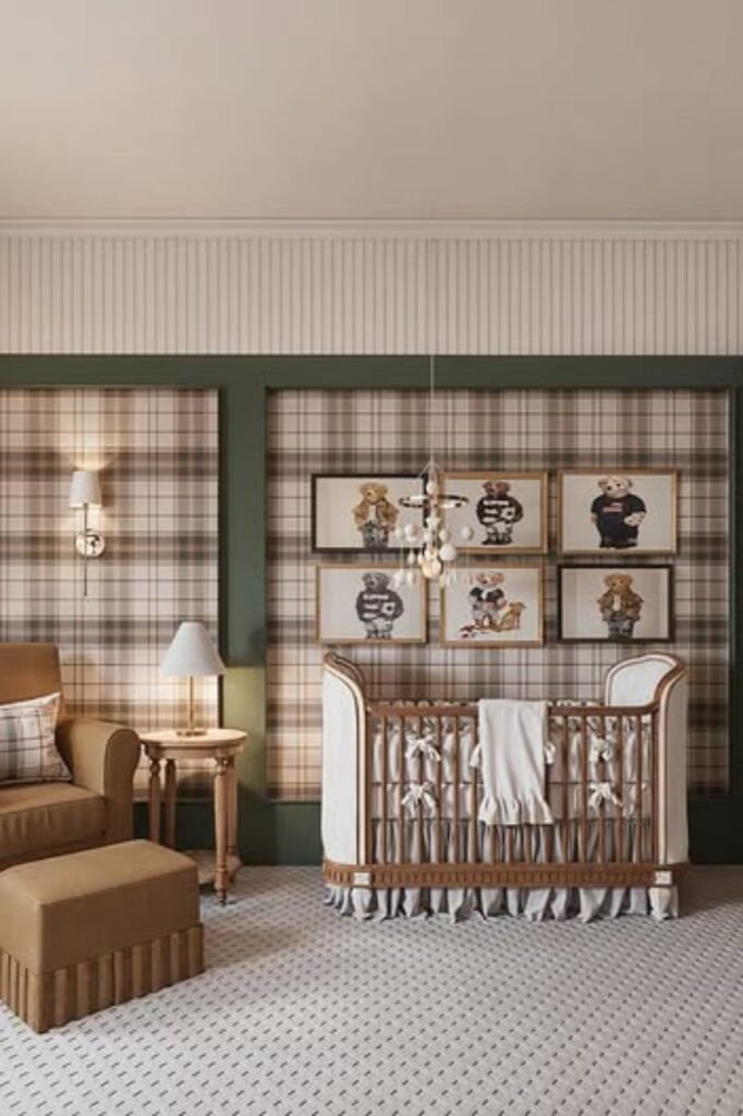 Nurseries don’t need pastel overload to feel soft. Warm plaid panels framed with deep green trim instantly create that Ralph Lauren heritage mood while still feeling cozy.