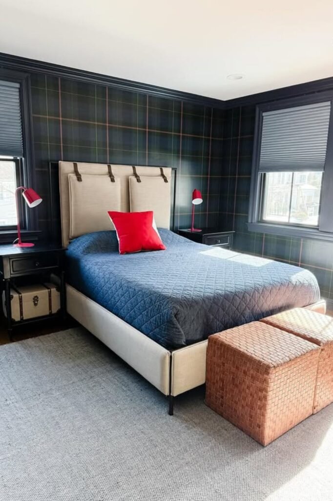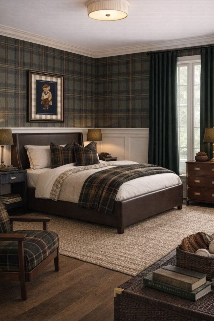 Drama works when you control it. Deep plaid walls in navy and green instantly give the room that Ralph Lauren heritage feel, but the key is balance.