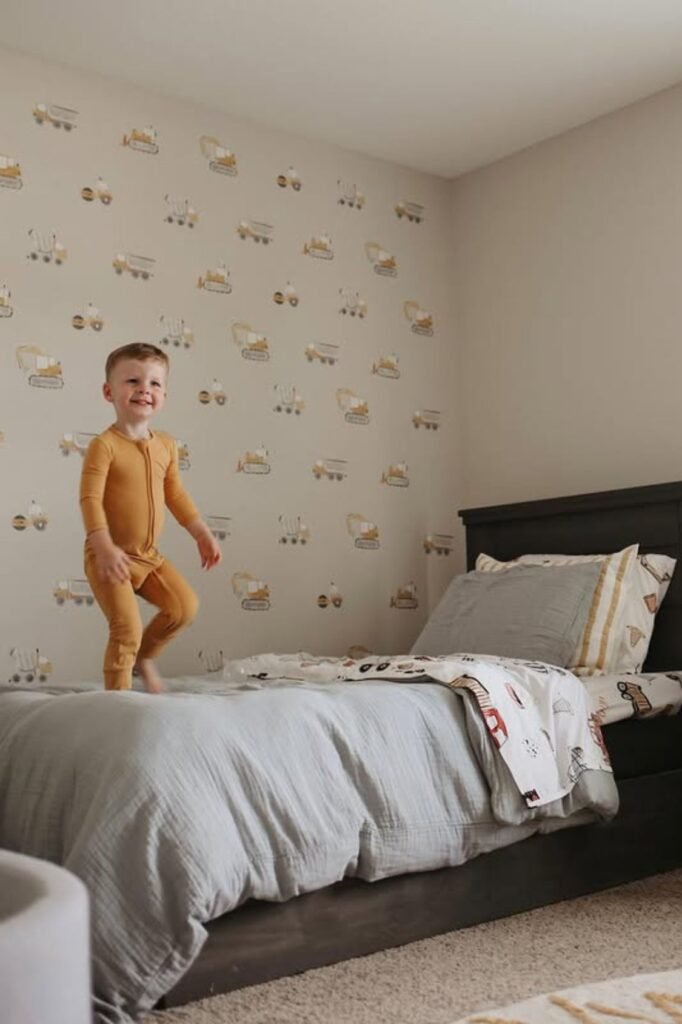 Growth happens fast, so design for movement. Soft vehicle wallpaper adds charm without overpowering the room because the scale stays small.