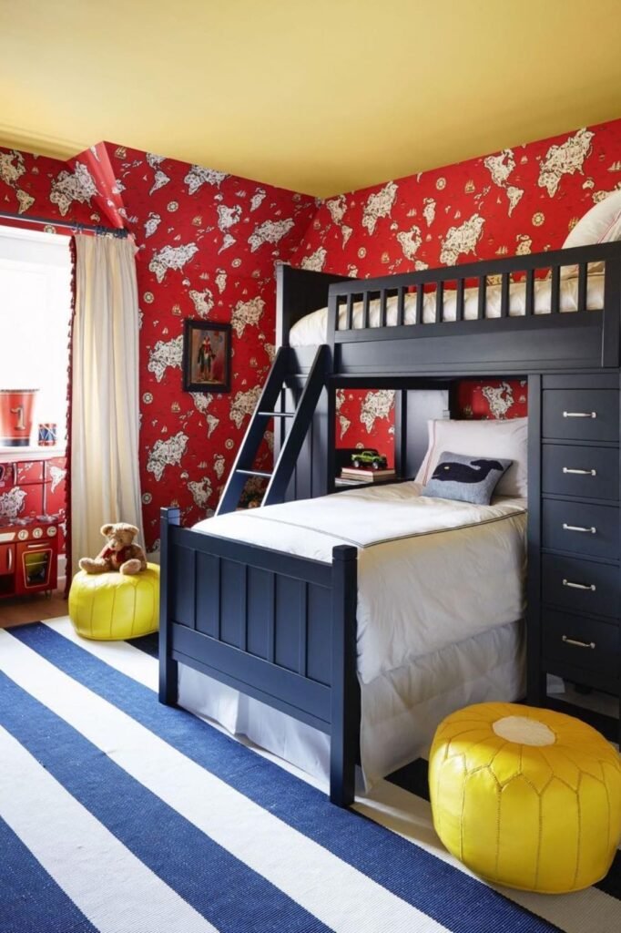 When you put it with a navy loft bed, it keeps the space grounded and the red doesn’t feel too much.