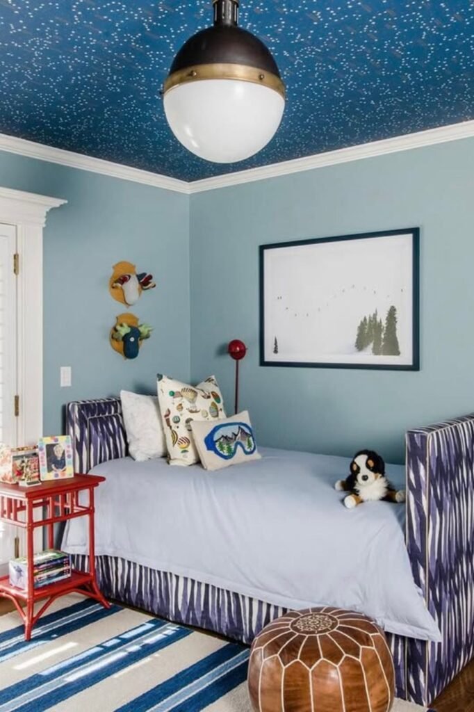 Looking up should feel magical. A deep blue ceiling with scattered white specks instantly adds personality without overwhelming the walls.