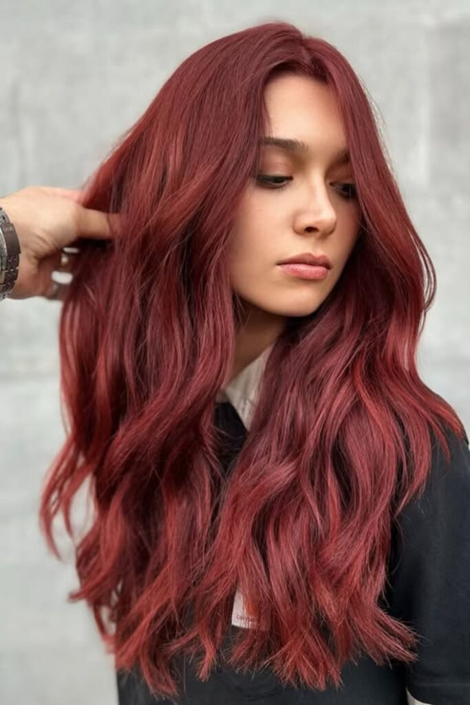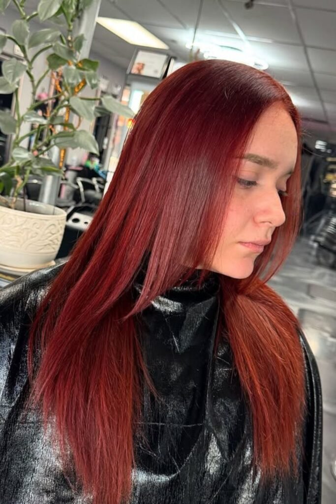 To do it again, ask for a level 5–6 red copper with more violet-red pigment to add depth. A smooth blow-dry will show off the sheen and keep the deeper colors from seeming flat.