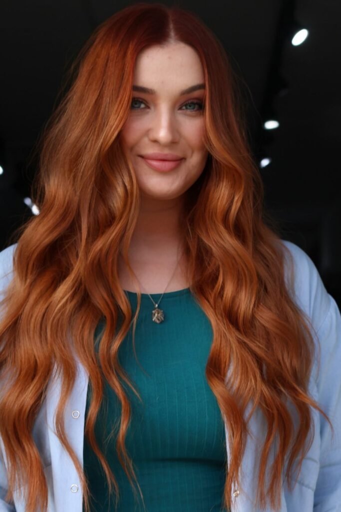 Ask for a level 7–8 copper with a touch of gold to warm it up. Using a light curl cream makes the hair springy, so the color never looks flat.