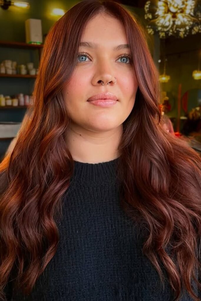 Deep auburn like this brings instant richness to olive and cool undertones, especially when you want depth without losing brightness.