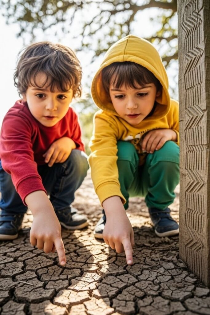 Hidden loot turns imagination into movement fast. Bury coins, small toys, or clue cards under leaves, logs, or tree roots and let kids follow simple hints to find them.