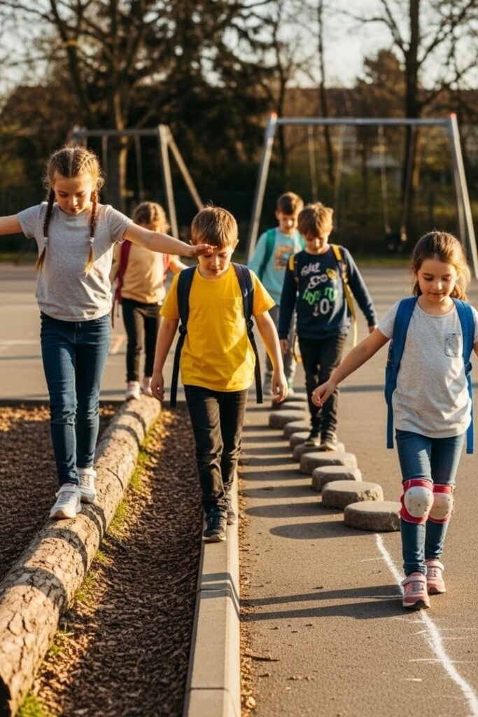Ask kids to follow a route using only balance points like curbs logs stepping stones or taped lines.