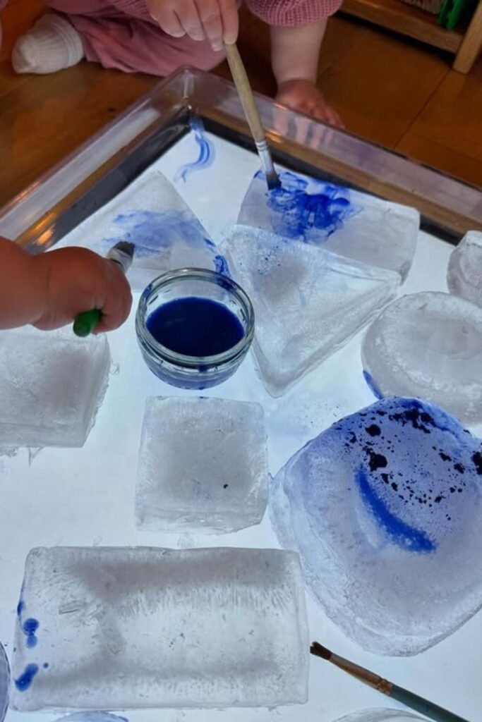 As the children paint, the ice melts transforming the activity into a blend of art and exploration as they search for shapes, colors, or patterns.