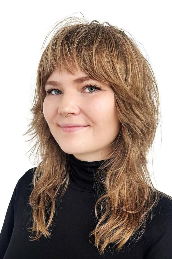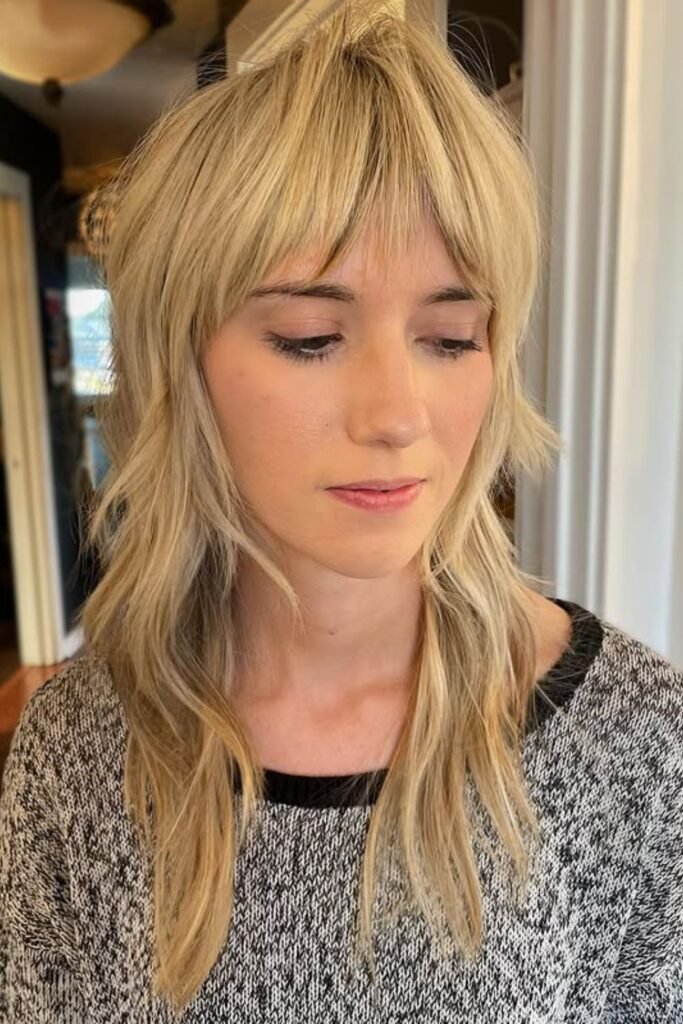 The feathered curtain fringe frames the face, and the jagged mid-length layers give the hair volume without making it look heavy.