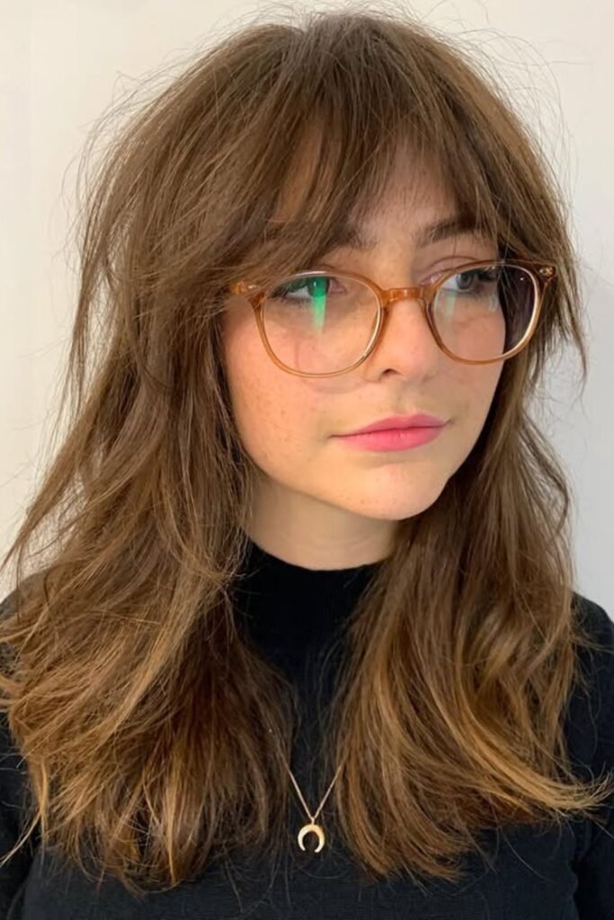 To get this look, ask for long layers that start at the jawline and a soft curtain bang.