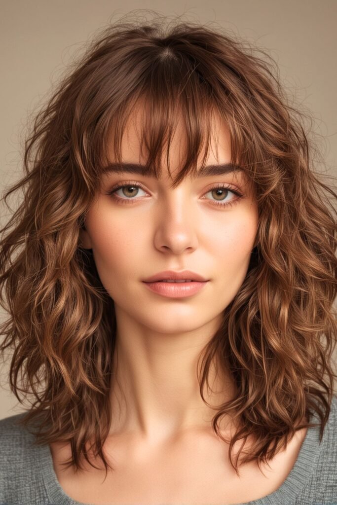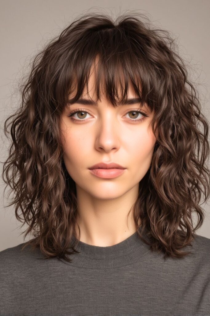 The choppy bangs sit just above the eyebrows, adding a bold and edgy contrast to the soft waves.