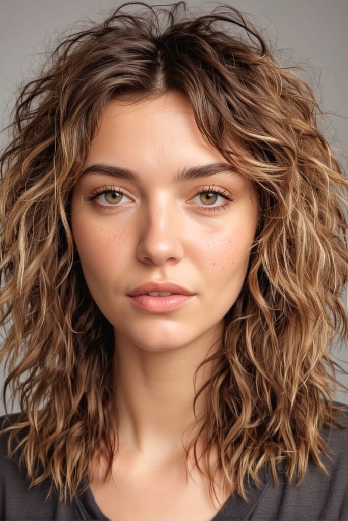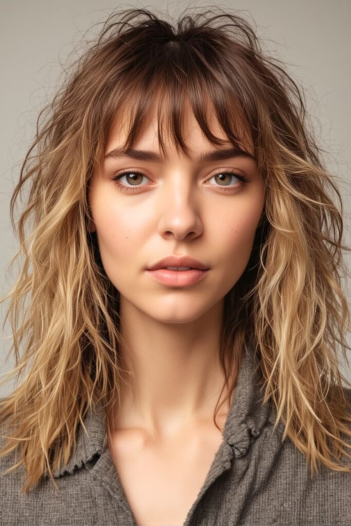 This hairstyle features a beachy shag cut with loose, tousled waves that create a relaxed, sun-kissed look.
