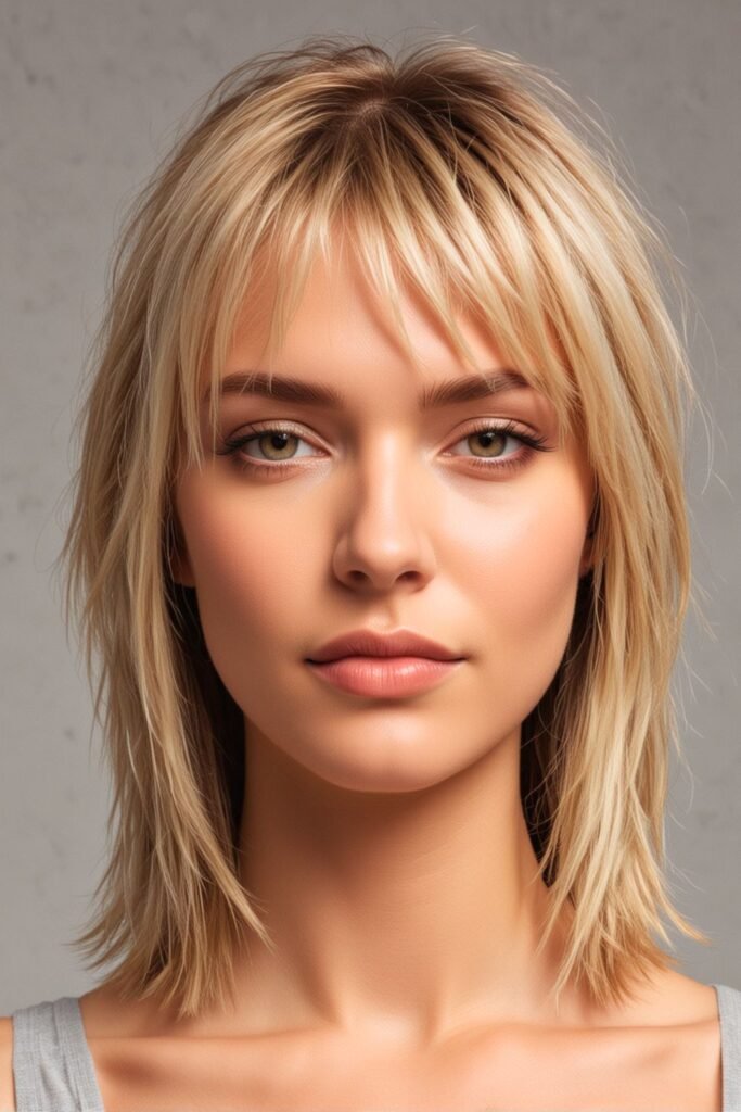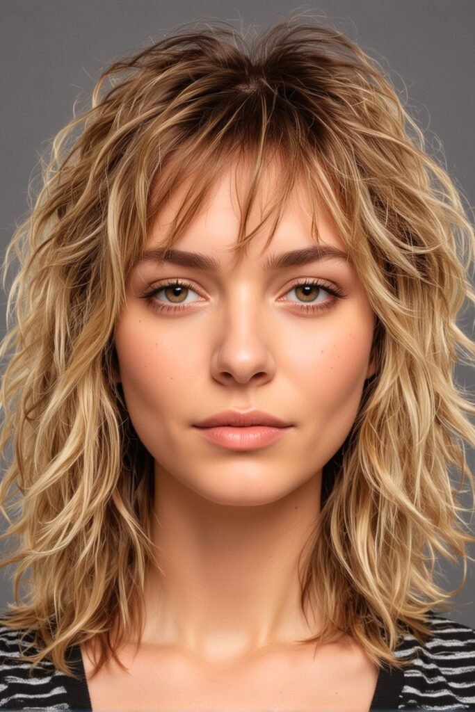 This hairstyle features a layered shag cut that adds volume and texture, creating a dynamic and lively look.