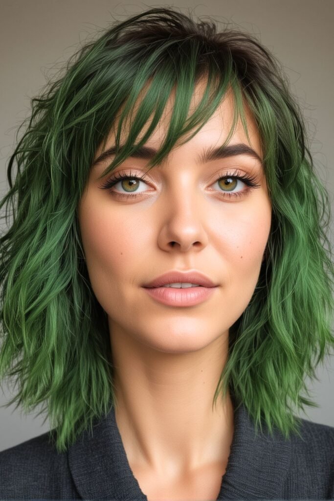 The standout element is the vibrant green accents around the face, adding a bold, eye-catching touch to the style.