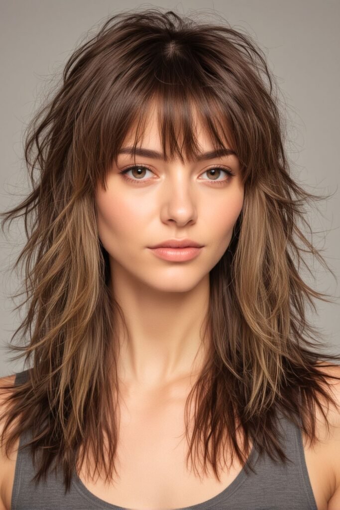 30. Long Edgy Shag with Layered Bangs