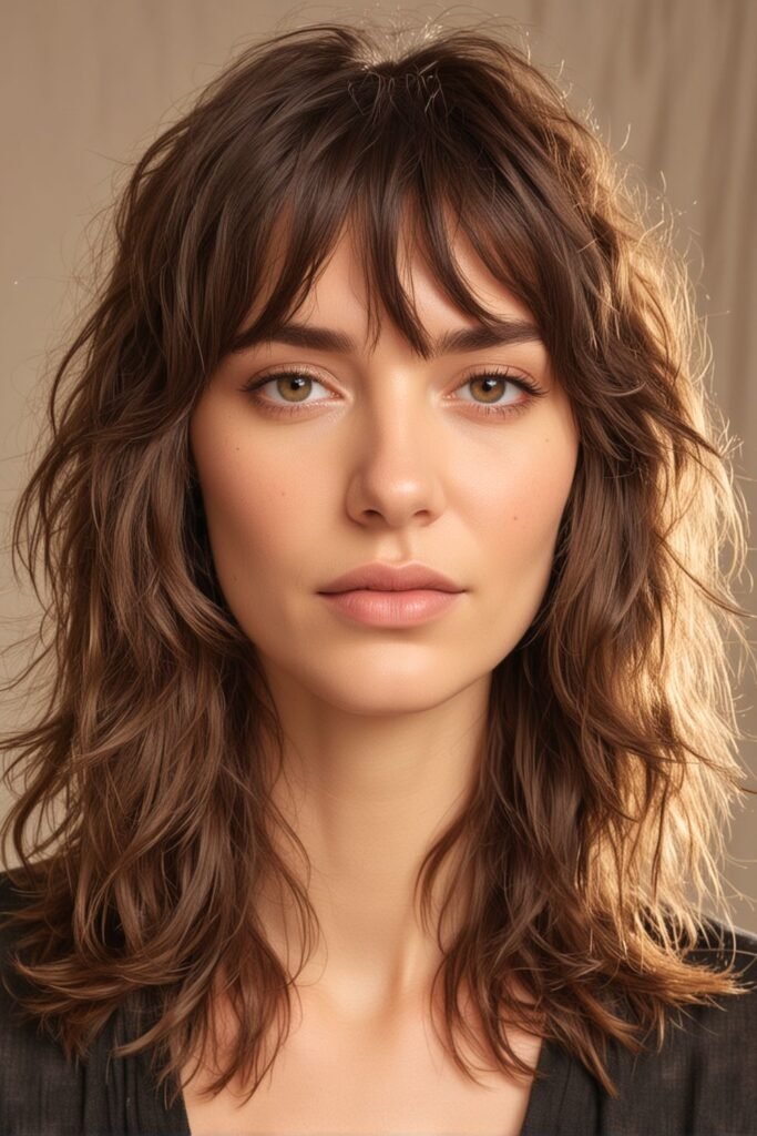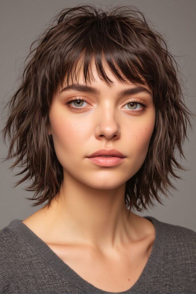 The dark brown color enhances the fullness, while the choppy, uneven layers create a playful, dynamic look. The bangs softly frame the face, contributing to the effortless, casual vibe of the style.