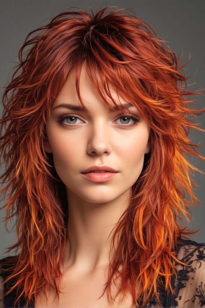 This hairstyle features a fiery red shag cut, highlighted by long, feathered layers that add depth and dimension.