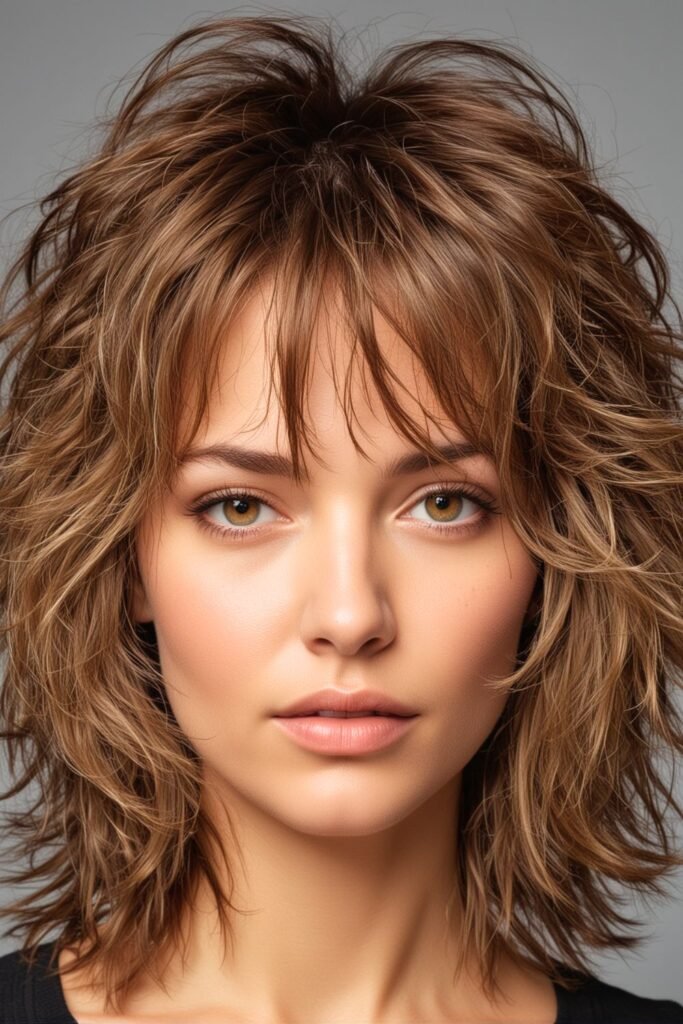 This hairstyle features a voluminous shag cut with dramatic layers that create a lively, textured look.