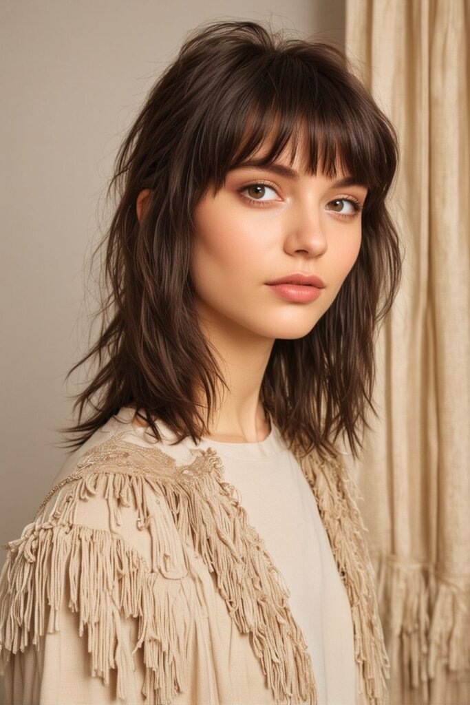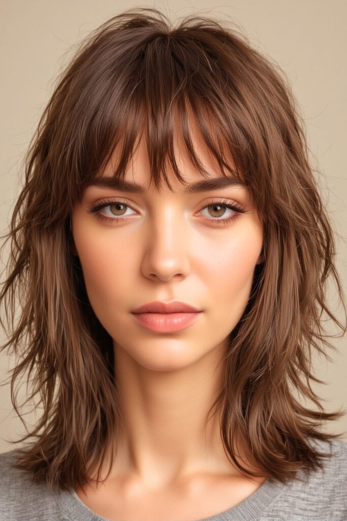 This hairstyle showcases a layered shag cut with feathered bangs that create a soft, elegant look.