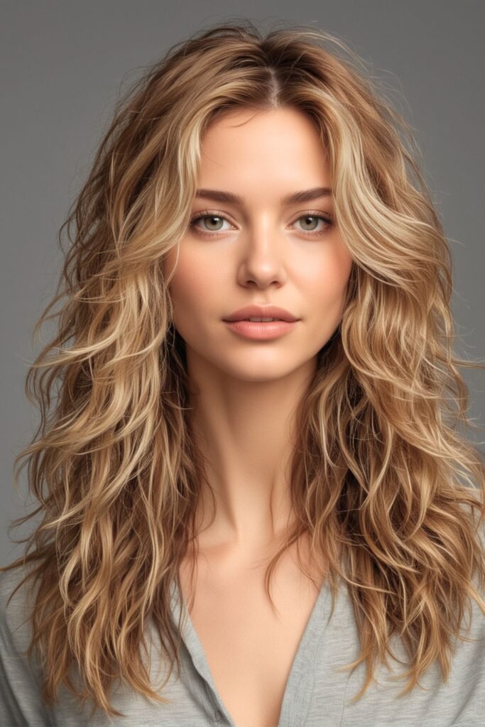 This hairstyle features a long layered shag cut, enhancing the hair’s natural volume and movement.