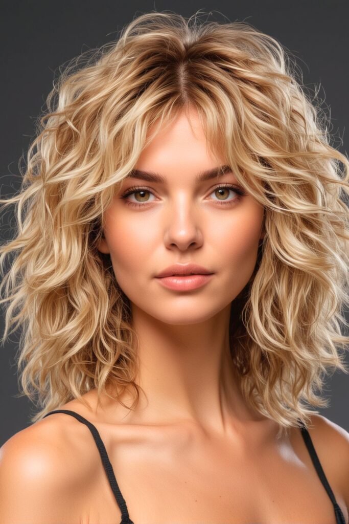 This hairstyle showcases a curly shag cut, featuring dynamic layers that add volume and texture.