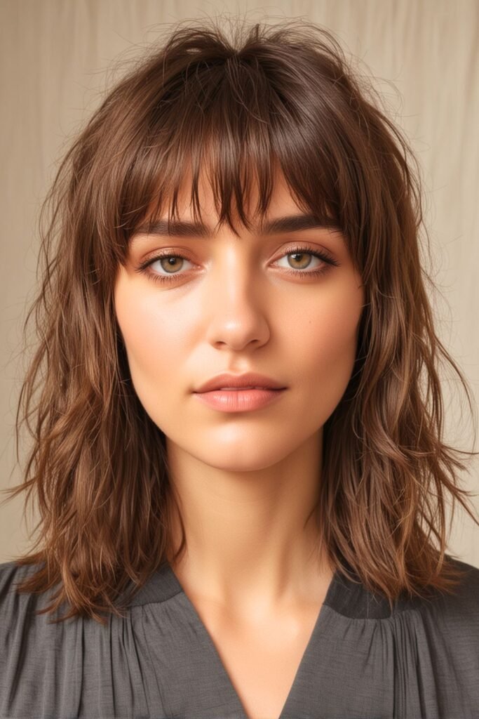 38. Wavy Shag with Blunt Bangs
