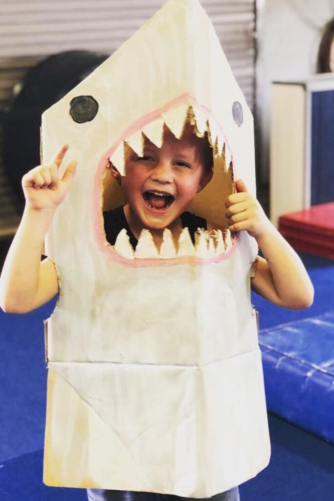 Dress-up flips the switch from crafting to full-body play. A cardboard box becomes the base here, and once the face opening is cut, kids are all in.