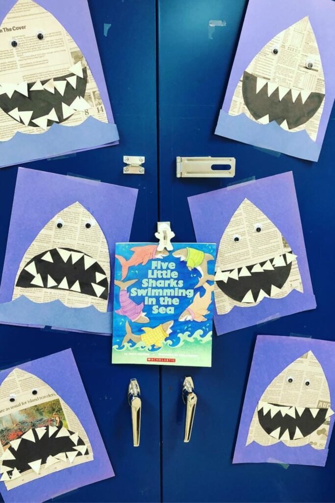 This is great for kindergarten classrooms, library tie-ins, or Shark Week displays because it naturally combines art with early reading.