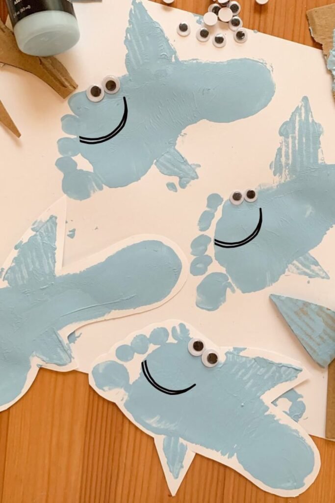 Then, cut basic fins out of construction paper and glue them on. Kids will love it right away, even if their painting isn’t flawless, because of the googly eyes.