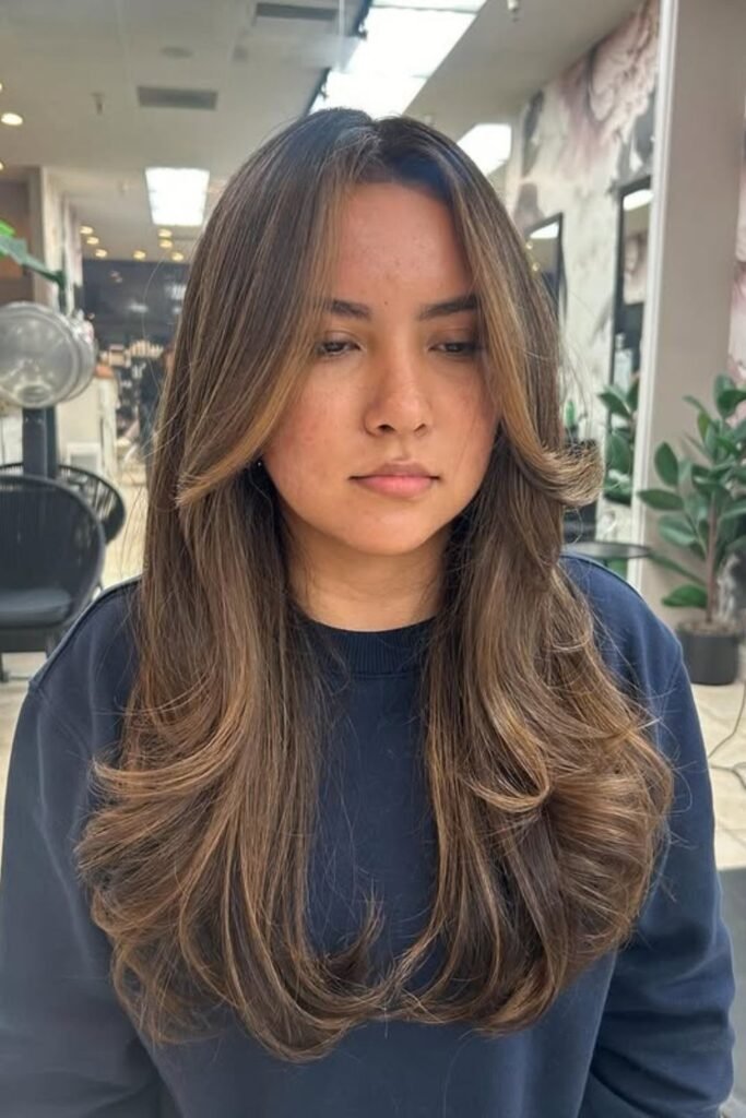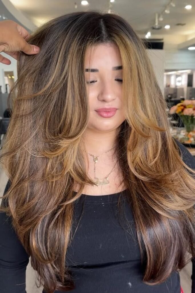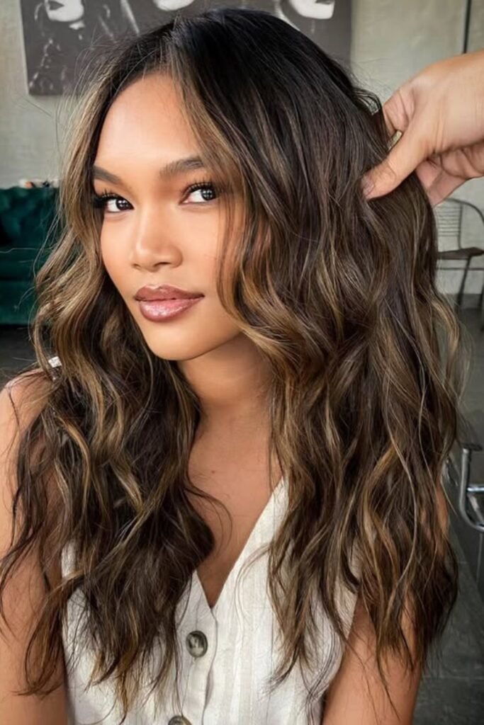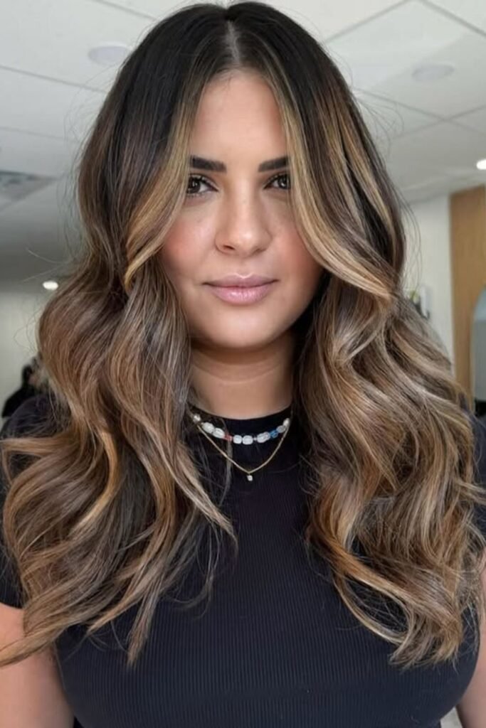 Layers come alive when honey tones sit against a deep brunette base. If your hair feels heavy or flat, ask for soft money-piece highlights.