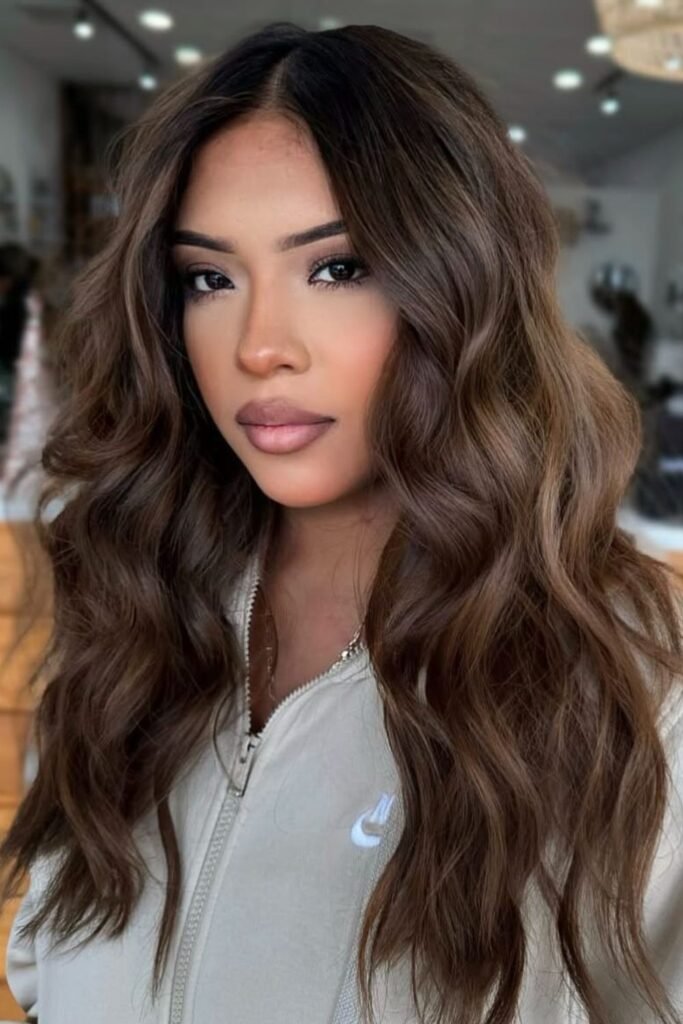 Walnut brown gives long layers a gentle lift without pushing too warm. Adding subtle highlights around the face.