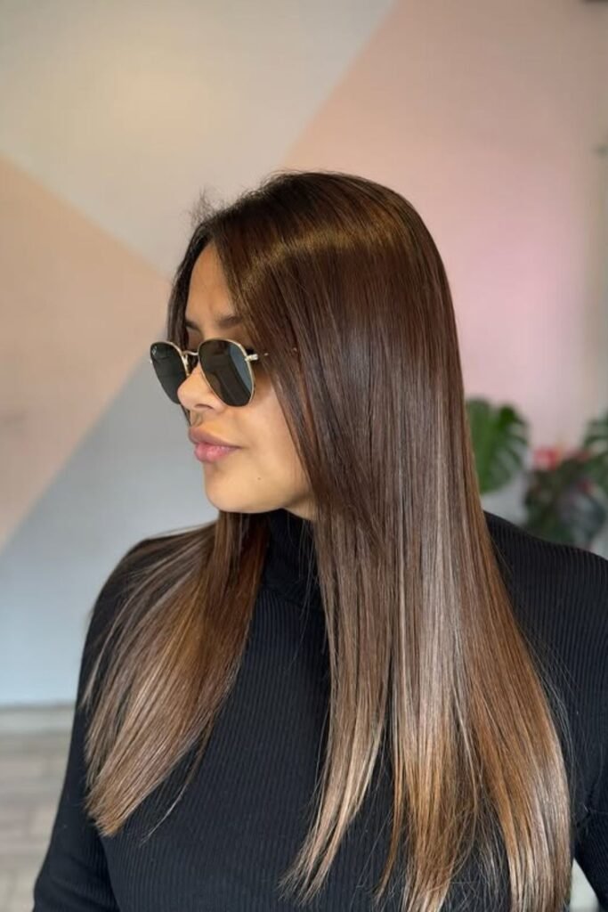 If you want a small change in size, ask for hazelnut balayage in the middle and ends. It makes movement that looks natural in any light.