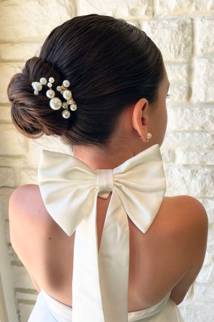 To give the style some soft dimension, tuck pearl pins into one side. To keep the whole look smooth and ready for photos, use a shine serum.