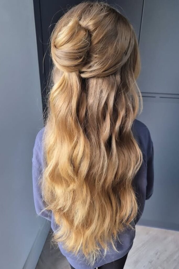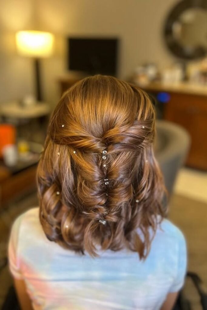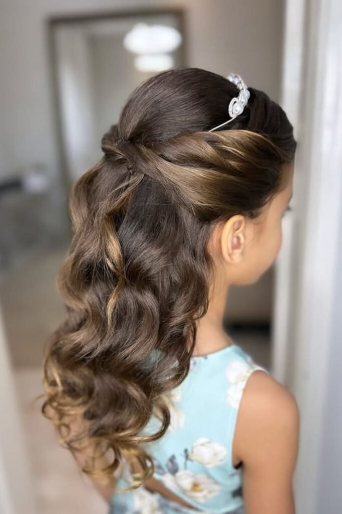 When the light hits those tiny diamonds, they glitter a little. This half-up style is great for birthdays, dances, or any other event.