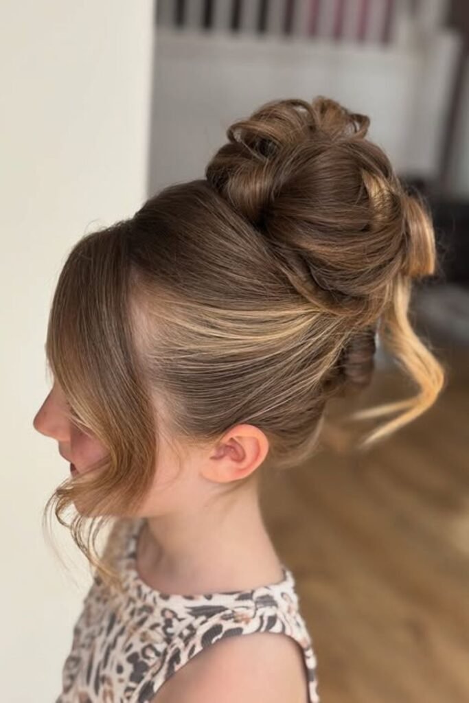 Graceful height becomes the main highlight with this full, sculpted bun, making it perfect for recitals, weddings, or any event where a polished statement fits the mood.