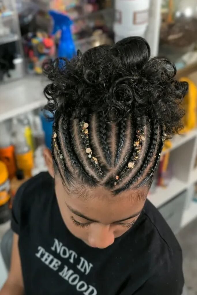 A bold, standout vibe shows up instantly with the tight cornrows feeding into that high cluster of curls, making it a great pick for birthdays, performances.