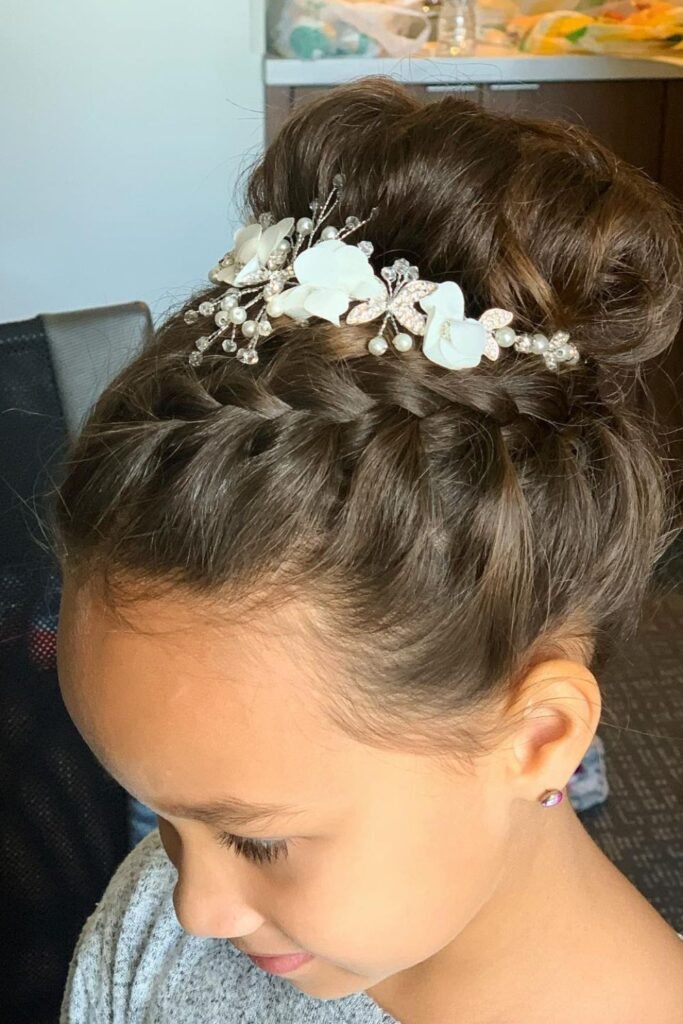 A graceful, formal touch appears right away with the braid outlining the front and the full bun rising behind it perfect for weddings, communions.